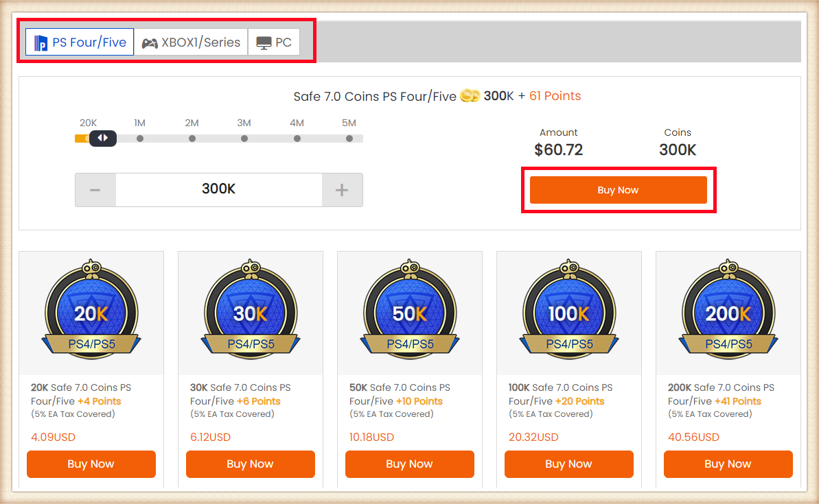 2. اختر وحدة التحكم الخاصة بك، ثم أدخل أو اختر عدد العملات التي تريد شراءها، واضغط على "اشترِ الآن".