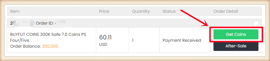 5. بعد إتمام الدفع بنجاح، يرجى الذهاب إلى مركز الأعضاء - سجل الطلبات - اضغط على "الحصول على اللاعبين".